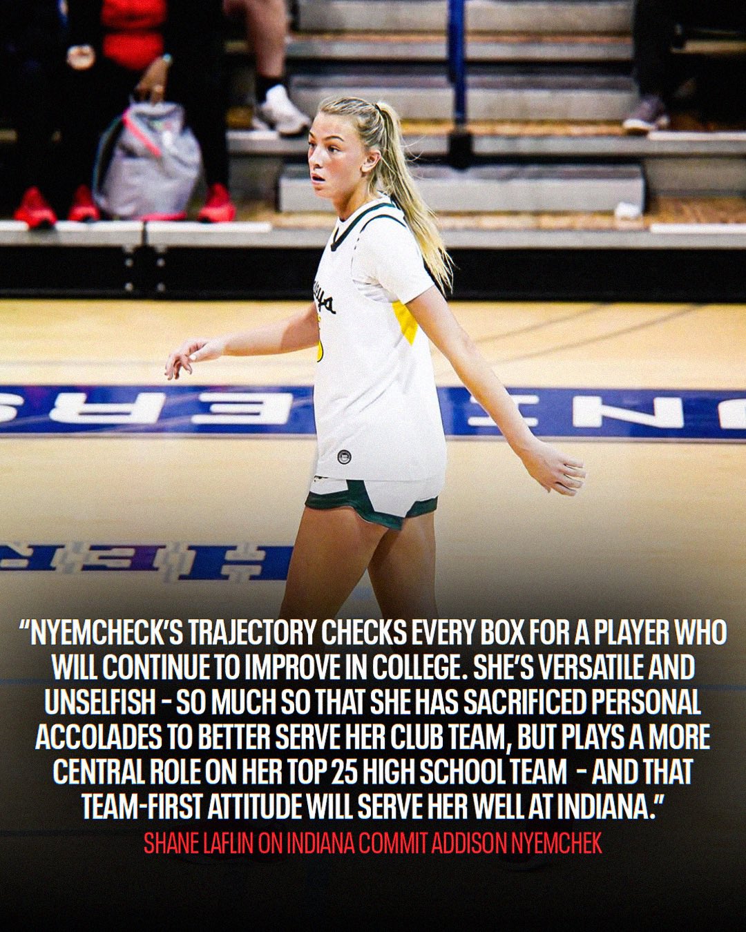 Most do not understand Defense. They do not understand defense is not just guarding the ball or stealing the ball. It’s defensively rebounding the ball. It’s rotating when teammates are beat. It talking and communicating with teammates and coaches. It’s knowing when to gamble in passing lanes and when not too. Nobody does this like Addy Nyemchek. She not only block shots shots in the lane, she changes shots in the lane, she boxes out in the lane, she bring a physicality in the lane, nobody gets more deflections or tips during a game, she had just under 100 steals this season from the forward spot in most nights.. These are hustle stats and what makes Addy Nyemchek so much different than everyone else. It why INDIANA UNIVERSITY Is excited about having their “FIRST” McDONALD ALL AMERICAN in their schools history. A player who can change a game, with a block shot, a rebound in traffic, a steal or tip. A player that can impact the outcome of a game without ever scoring a point.